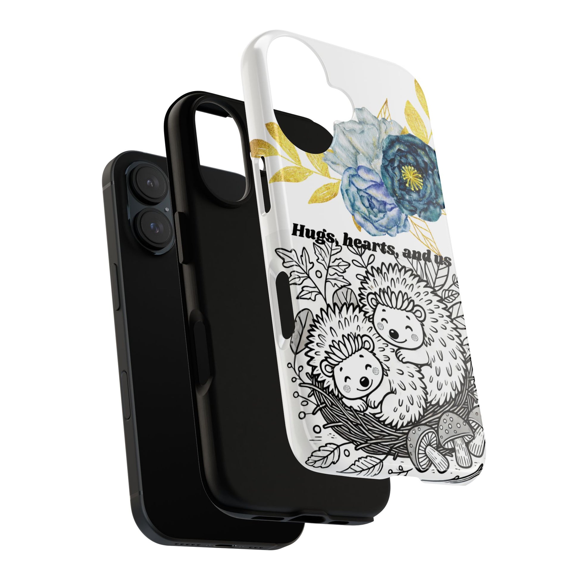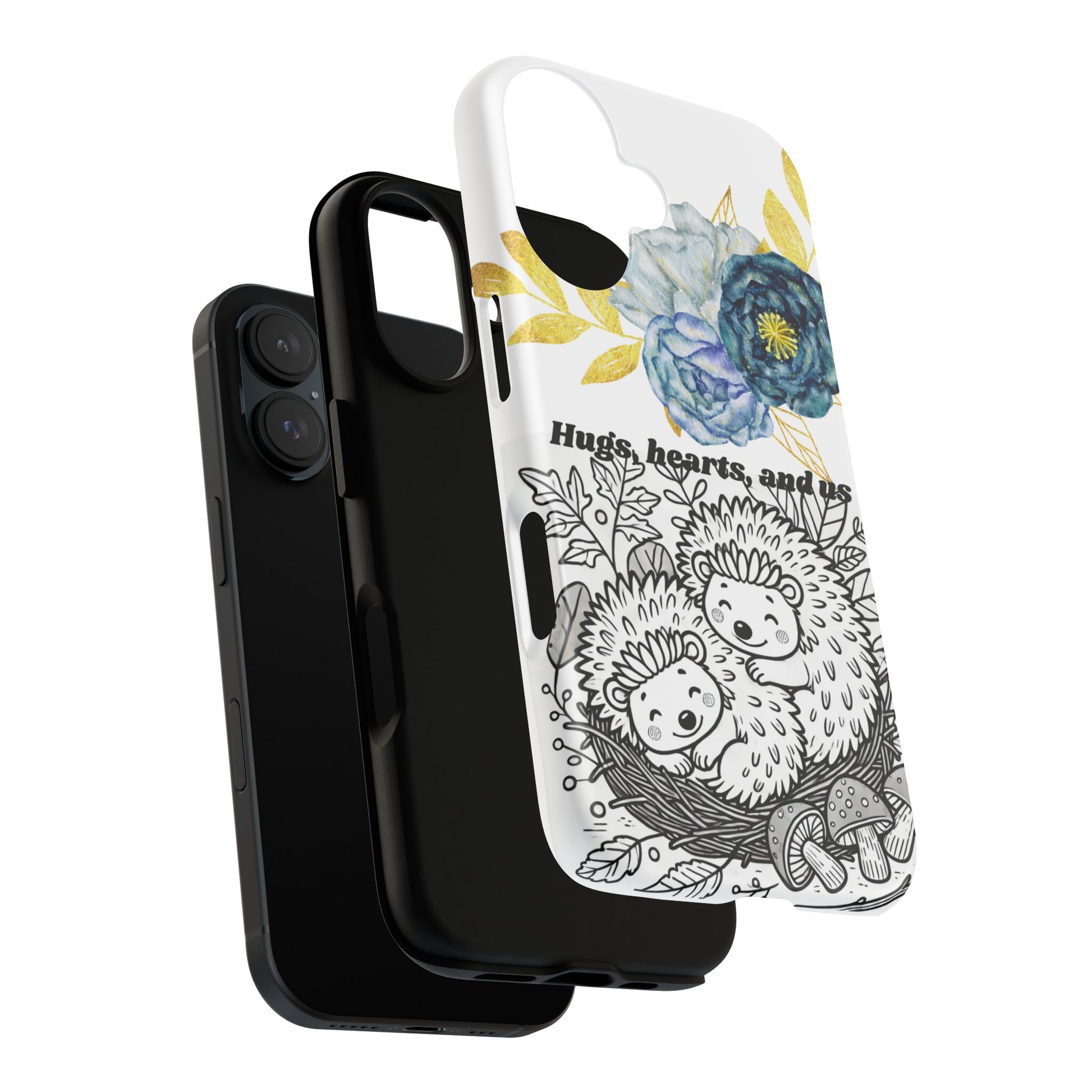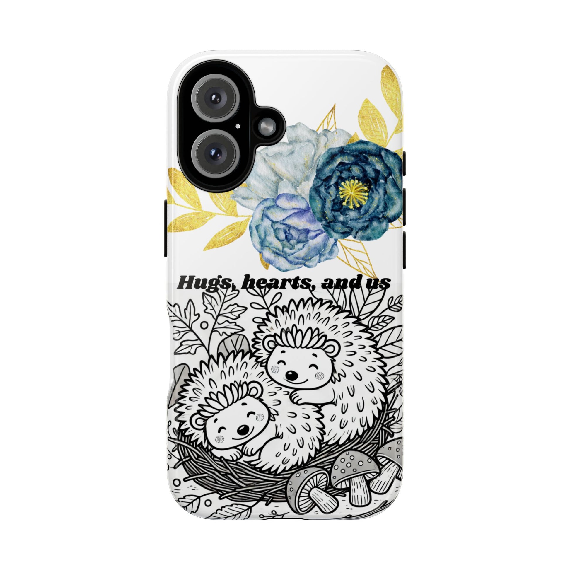 A phone case featuring a black and white line art illustration of two adorable hedgehogs enjoying a sweet Valentine’s moment. The design captures warmth, love, and peaceful companionship in a minimalist style, perfect for Valentine’s Day gifts or cozy animal-themed designs. Ideal for adults who appreciate cute and romantic aesthetics.